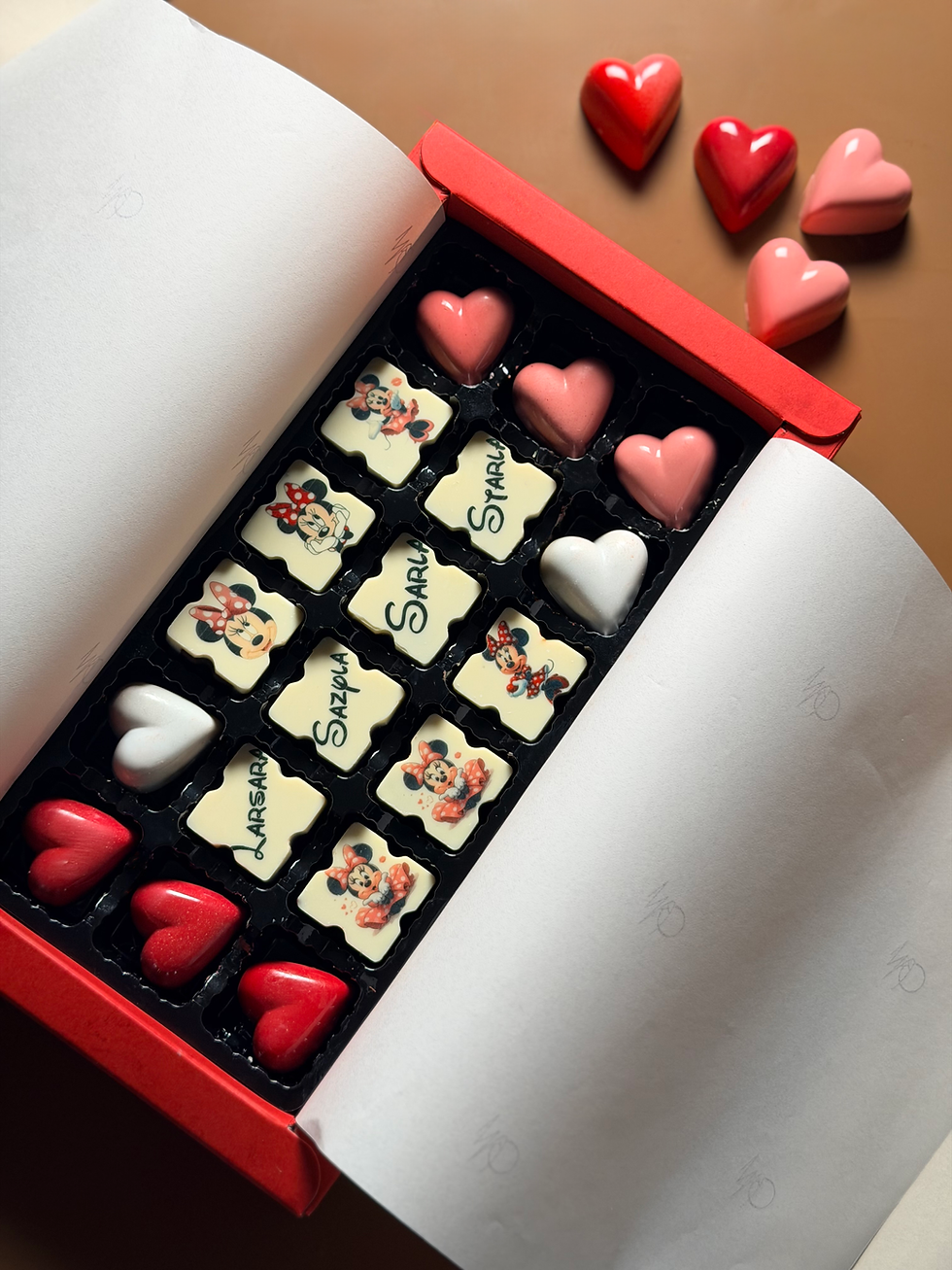 Choose all heart-shaped bonbons, all printed bonbons, or a mix of both — personalized just for you.